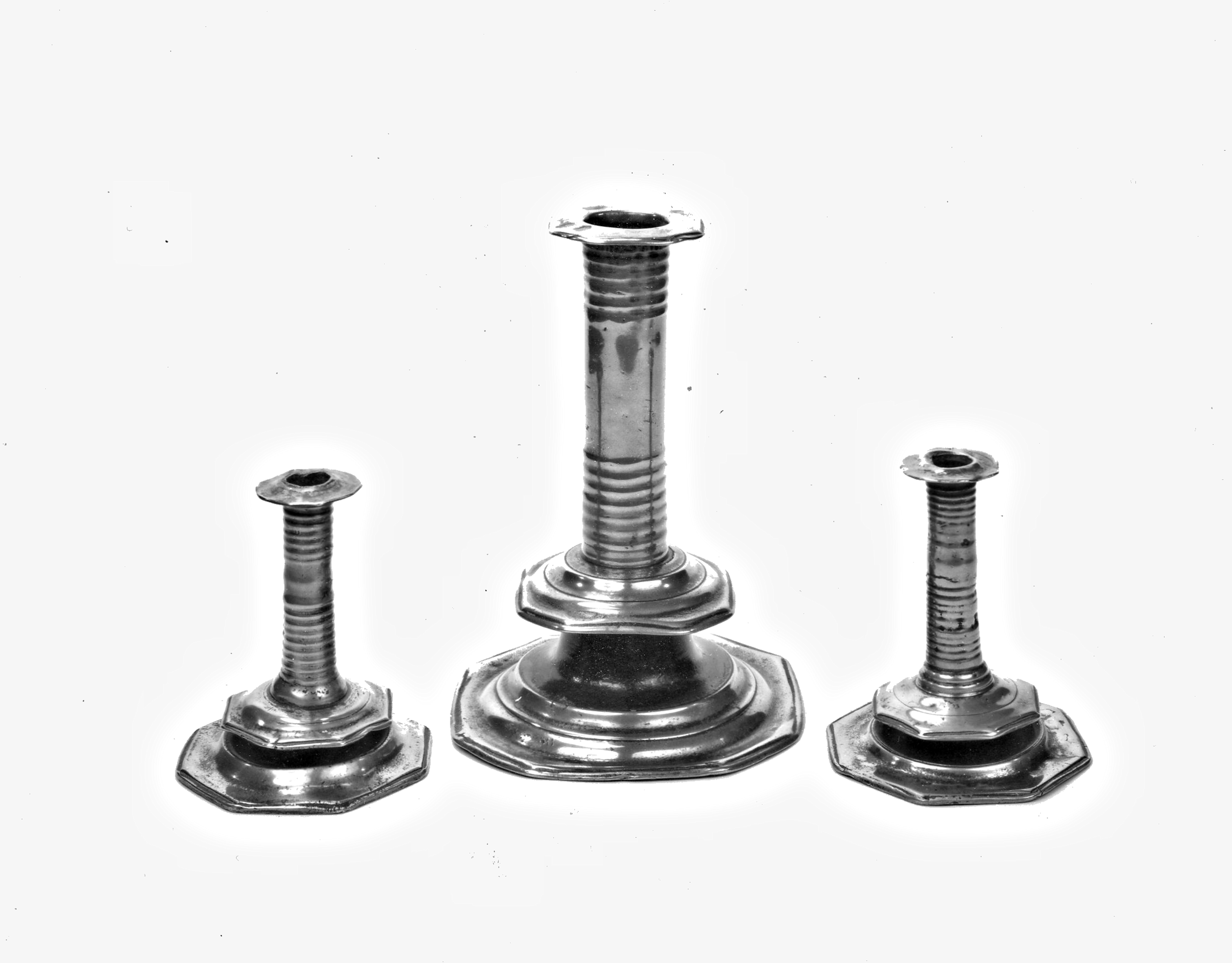 Pewter candle sticks have been known since the 14th Century but very few still exist, those from the 17th Century are more common with designs of a bell, circular or octagonal bases . The single column may have a knob , be twisted or have a small drip tray all ending in a socket to hold the candle. 18th Century designs followed those produced in brass but it is rare to find candlesticks from this period due to the efficient method of repetitive casting for brass candlesticks so the most common found today are those made in the 19th century .