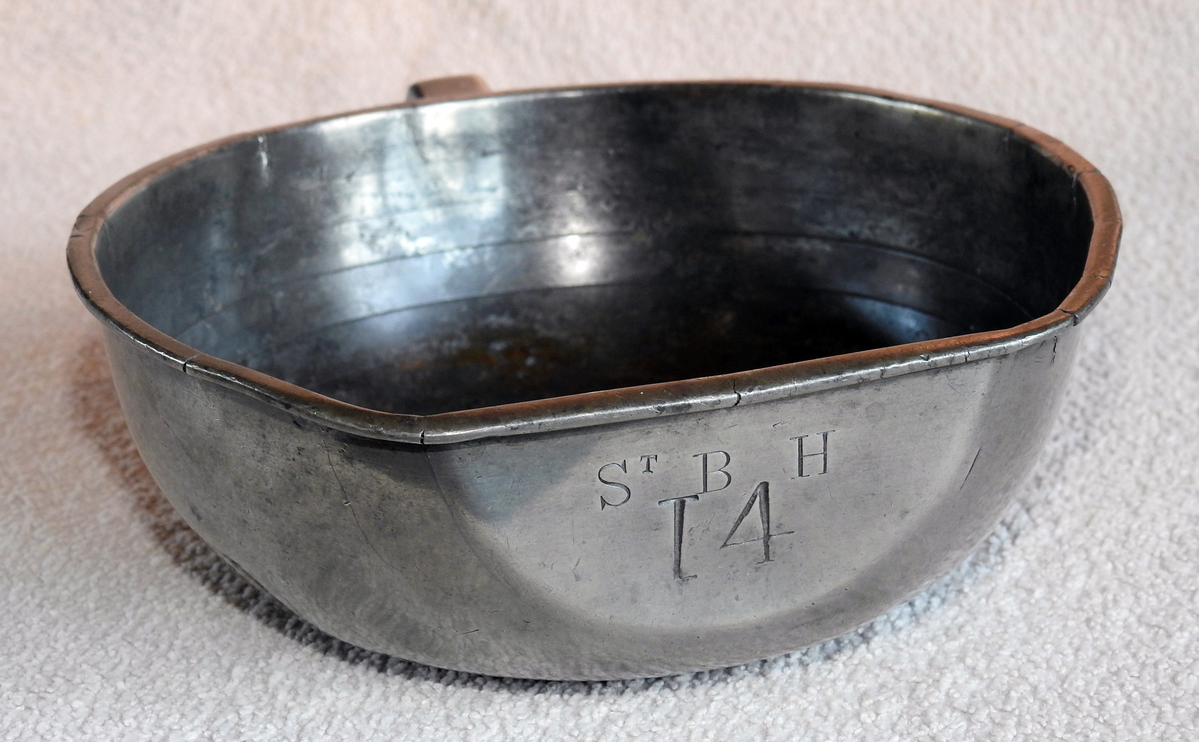 Large narrow-rimmed bowls usually date from the late C18th to the early C19th. A hammered bouge suggests British, not continental manufacture. They were often exported to America, where they are called basins but examples turn up in the UK too. Bowls by London and Glasgow makers occur most often, but they were probably made more widely.The use of four ownership initials, rather than a triad, is common in Scotland,but it can also occur elsewhere, especially on church pieces.