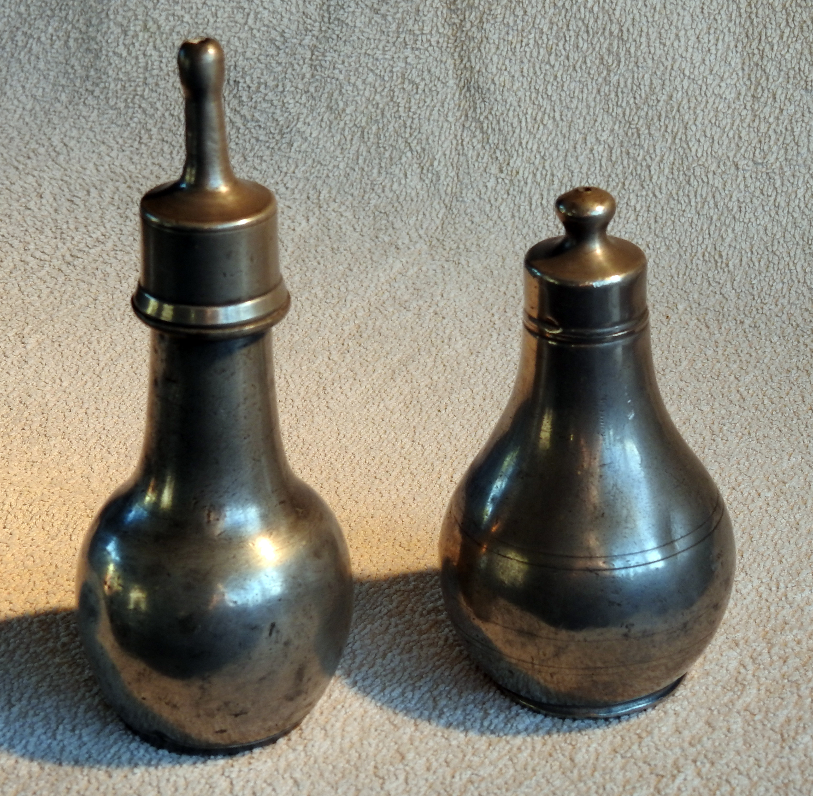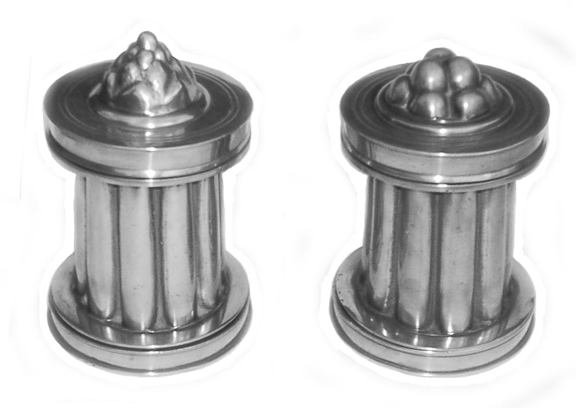 The use to which “sifters” were put is not always easy to determine. Where the holes are large the sifter was probably intended for sugar, small apertures implying spices or pepper. In early sifters the holes are roughly cut but after 1700 — 20 they are neatly drilled. Complete sets of three “casters” occasionally occur. Most sifters derive their shape from silver forms. The baluster style appeared in pewter around 1670 and had screw lids.Eighteenth century castors or sifters are uncommon although nineteenth century examples occur more frequently. Large quantities of small castors were made for pepper, many in britannia metal made in Sheffield or Birmingham.Owls, politicians,lighthouses and other various novelty peppers were made.