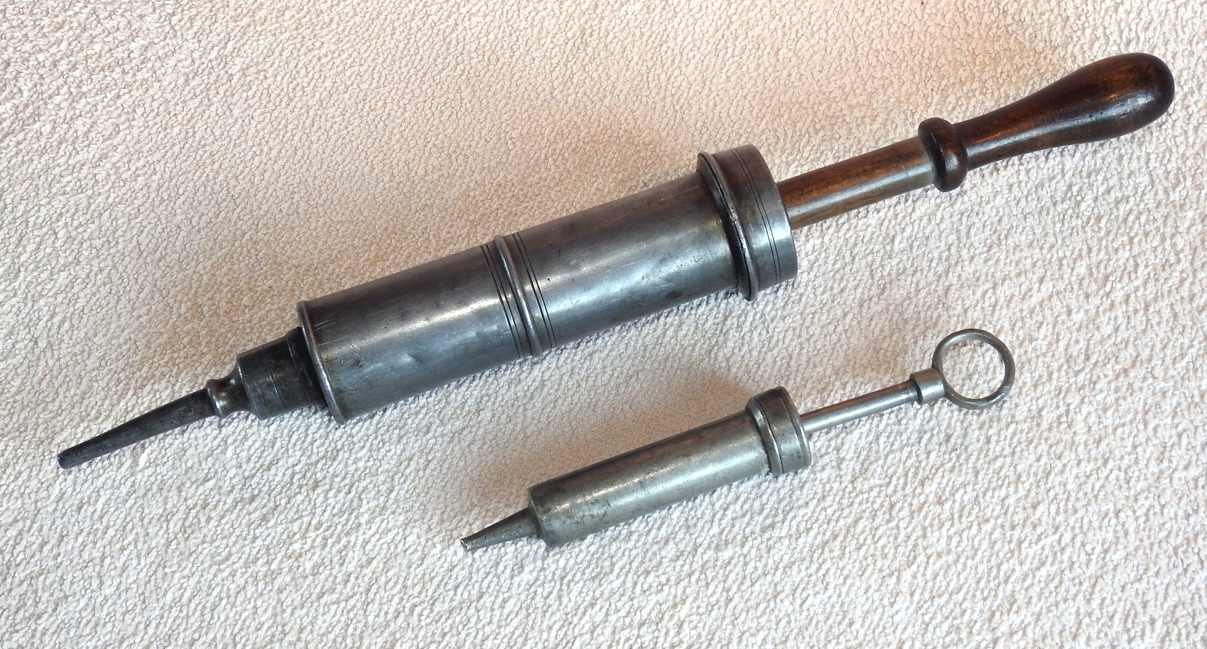 Pewter Syringes come in many sizes and one hopes that the larger ones were for veterinary purposes only! Items recovered from wrecks such as The Mary Rose have shed new light on exactly what was carried to war by the barber surgeon but we still cannot be sure of their exact use. Those with very long thin nozzel attachments might well have been used for flushing out wounds but instilling “mercury”, up the urethra, probably as mercuric chloride cream, as a misguided treatment of syphilis was certainly a common practice and not surprisingly urethral syringes have survived better than their original owners. Enema syringes are usually easily identified and there were even automatic clockwork ones which instilled the flushing fluid and played a tune whilst doing so, though these were French!