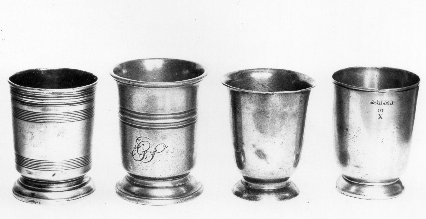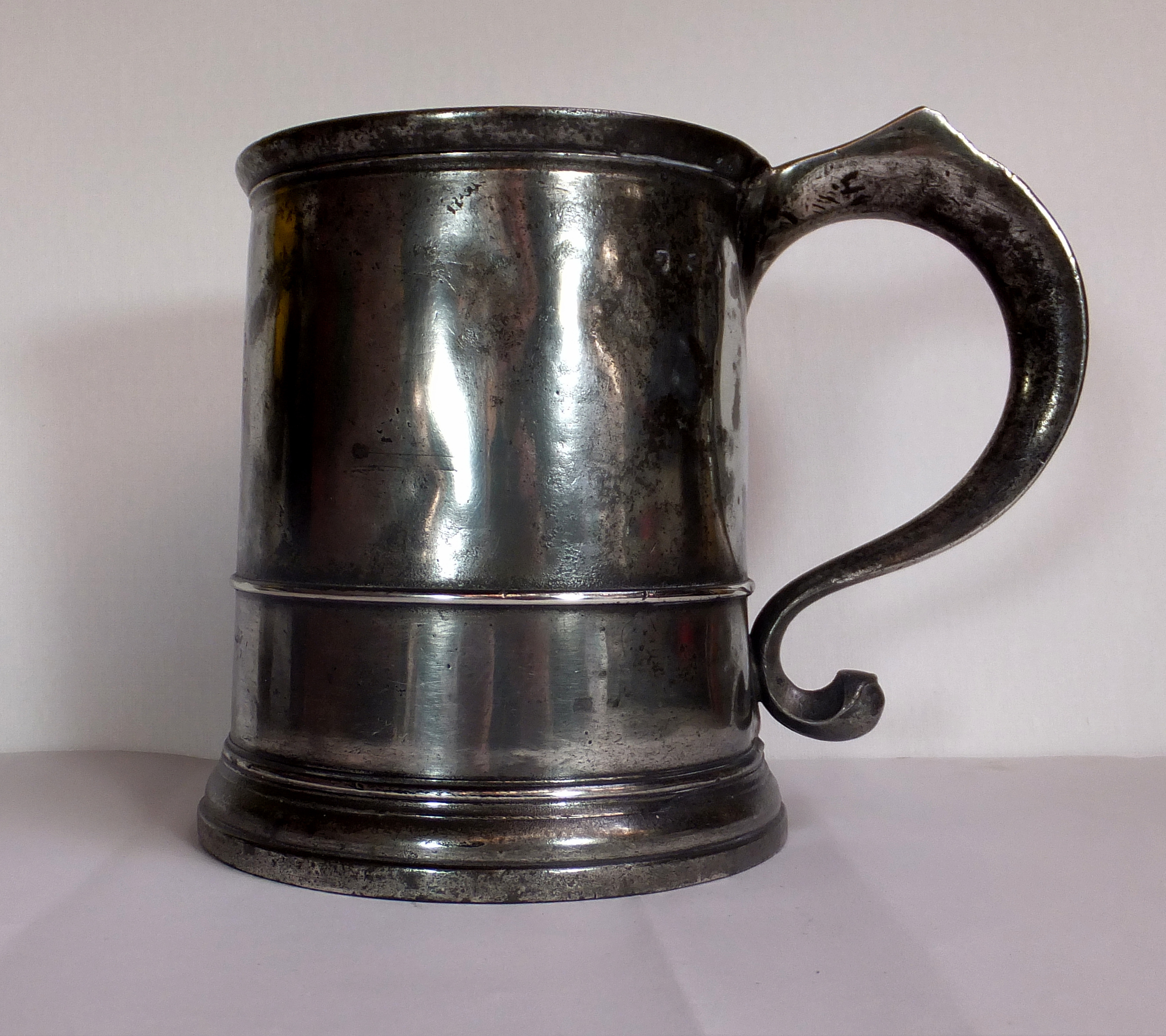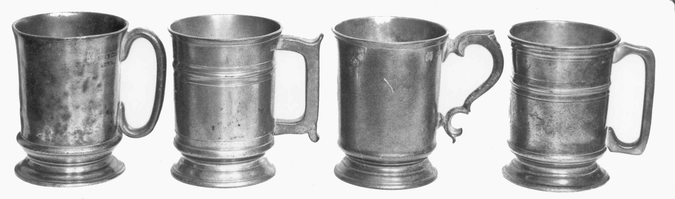 Eighteenth century tavern mugs are uncommon. The tall early form gave way to squat tankards, usually with a ball terminal to their strap handles. Examples before about 1750 tend to differ from maker to maker. About the middle of the eighteenth century, mugs with a “tulip” shape or with “U” shaped body were introduced.