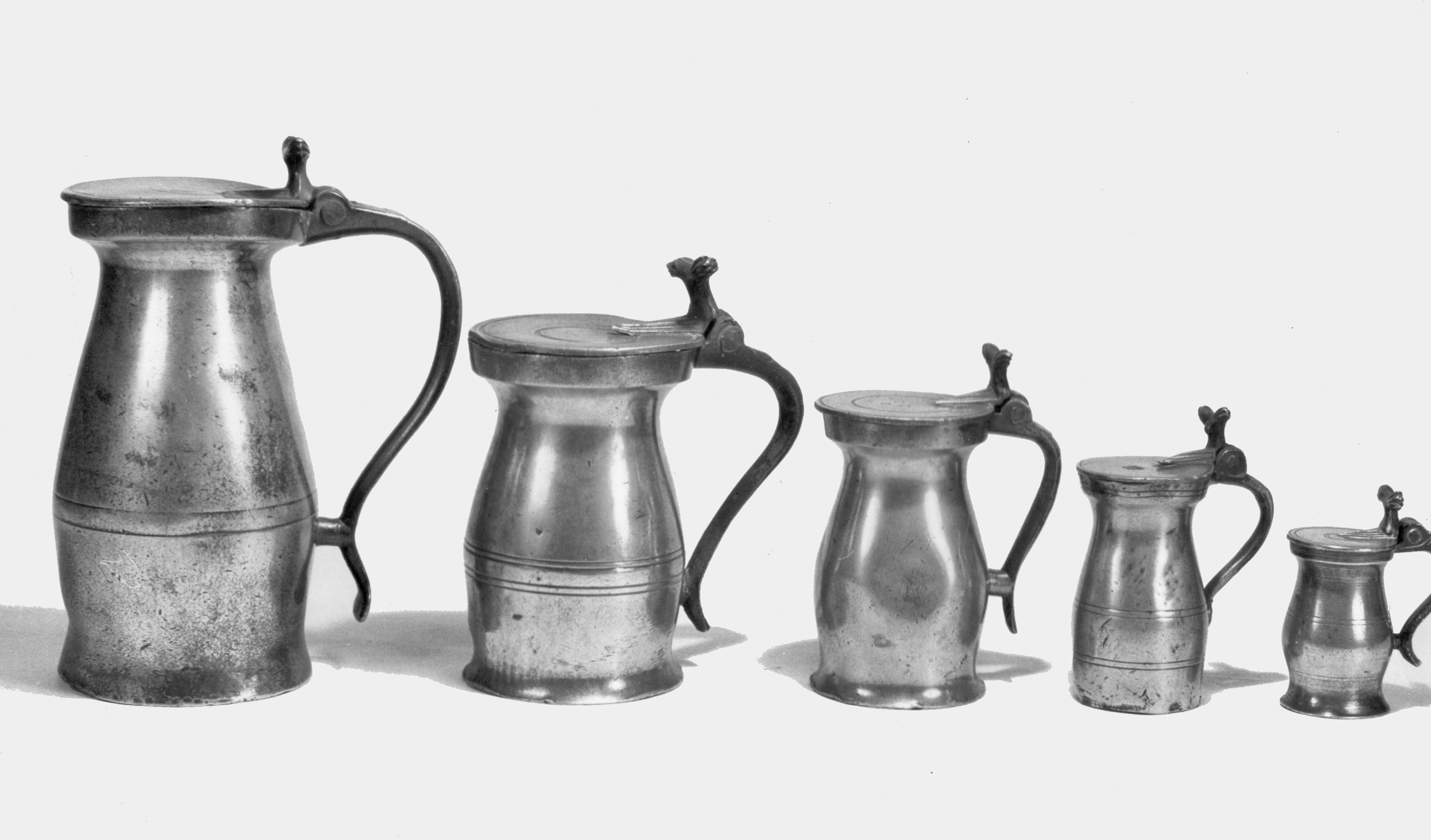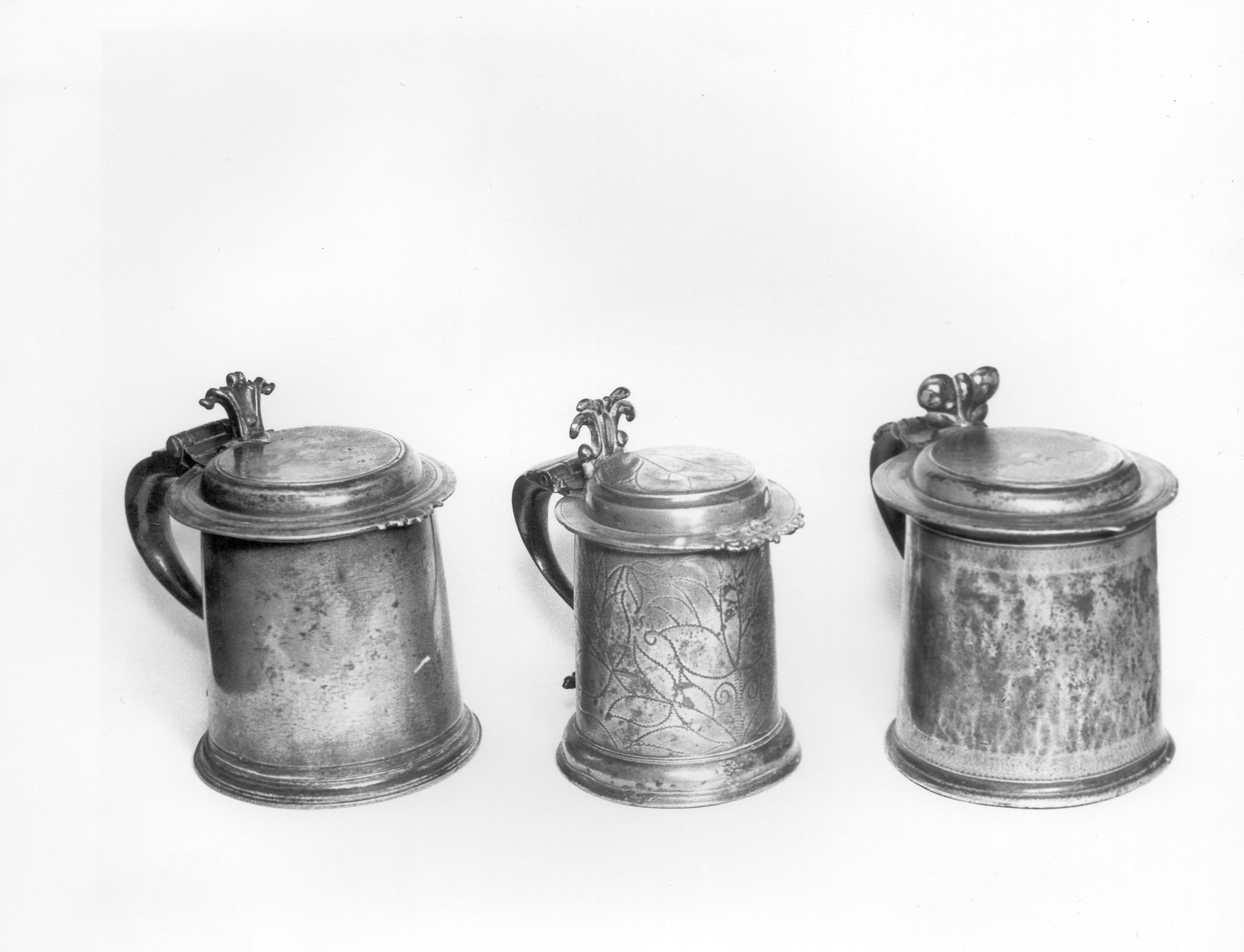 Around 1700 the dome lid started to appear. With these, the flat area of the lid is replaced with a second dome (which is why they are sometimes called ‘double dome lids’). A little later tulip-shaped bodies appeared, though straight-sided bodies continued as well. The production of tankards diminished towards the end of the 18th century as unlidded drinking vessels became more popular, but they enjoyed a revival in the 19th century when they were once more produced for trophies.