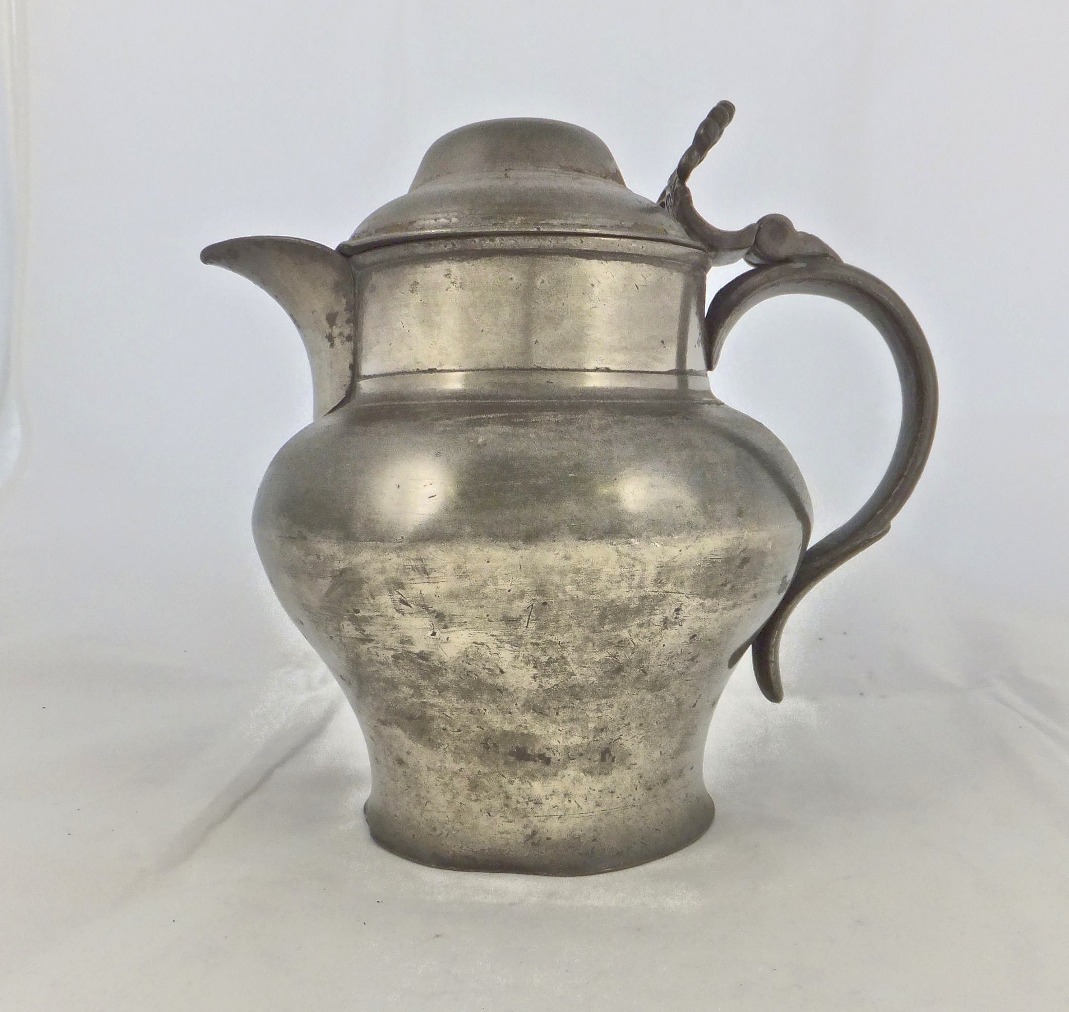 A flagon is normally any large lidded vessel with a handle from which drink is served .In the 14th century the main design known in pewter is octagonal , this then evolved to a round bellied or pear shaped flagon a few examples are in church treasuries. From 1603 after James 1st stated that all churches must have a vessel to dispense the wine , a standard flagon appeared which had a bullet base tapered sides domed top and knop ,known as James 1st type this evolved to a Charles 1st style with a bun shaped top to a beefeater flagon with a lid that looks like a beefeaters (yeoman warders) hat. All of the last 3 are from the 17th century . Flat lidded flagons were the next to appear at the beginning of the 18th century and by the middle of the century spire flagons appeared . Regional variations in York produced a domed flagon looking like an elongated tankard and the acorn type .