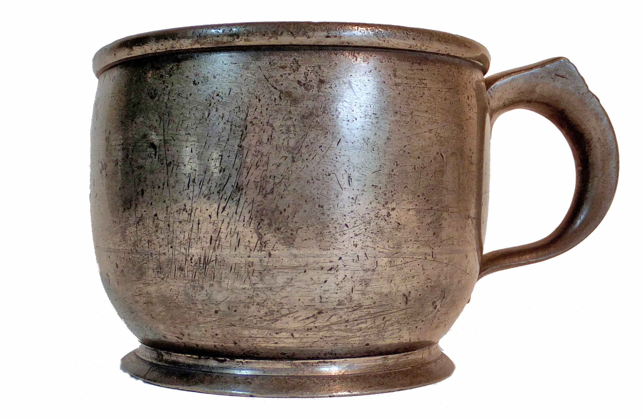 Glass-bottomed mugs began to appear in the 1790’s, some with clear bases, others with coloured glass, and they continued to be used throughout the nineteenth century.At some point in the mid-nineteenth century makers developed a range of mugs with thickened lips or rims. These were made with brass, pewter or copper lips or rims, the thickening presumably intended to strengthen them for the heavy wear they received. These rims are found on both straight-sided and “belly” forms.These were probably used in the sale of shellfish or grain.