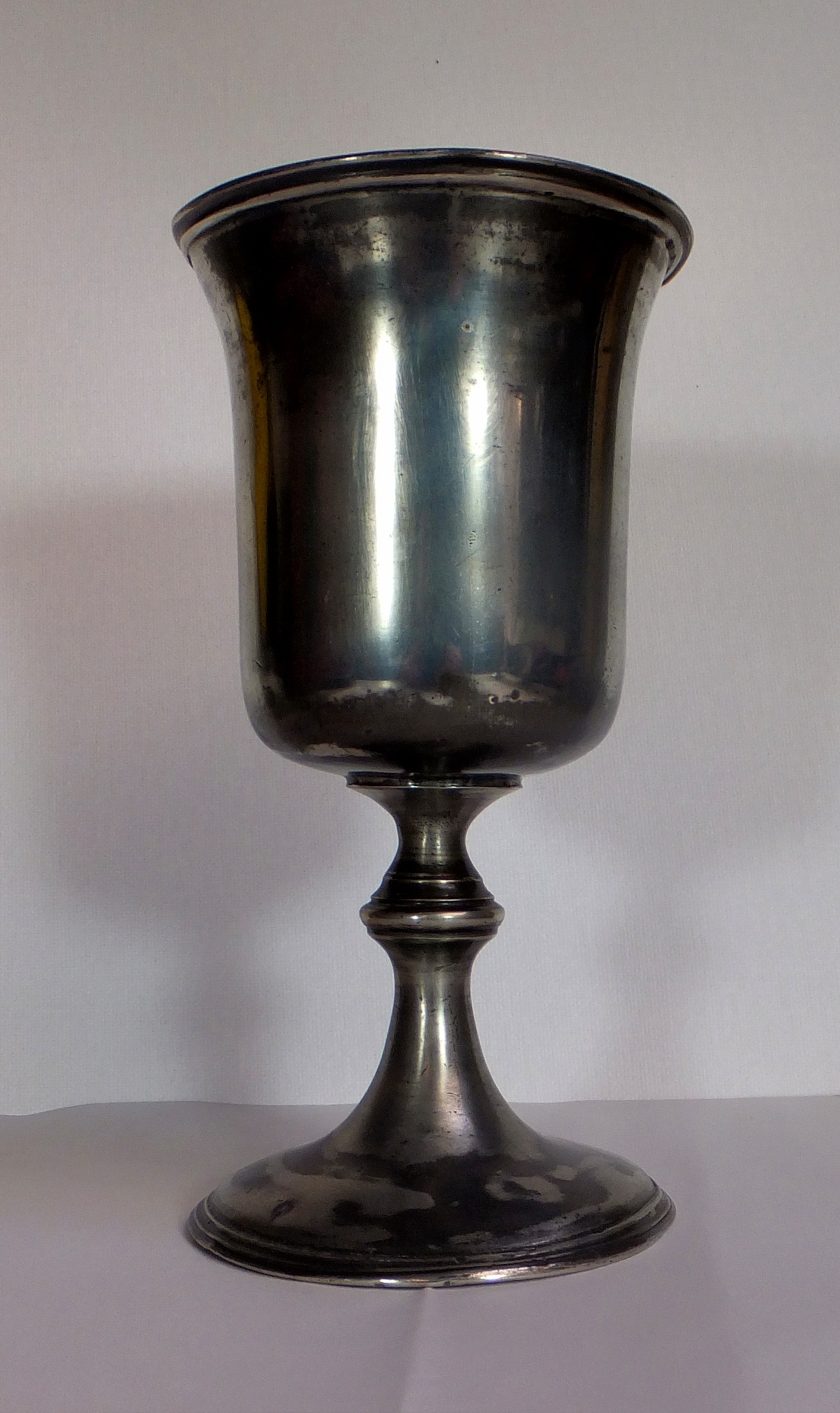 Goblets are defined here as cups similar to beakers, but with curved sides and a small stem or foot. Examples with decorated sides were popular in France and Switzerland around 1750. British goblets however are usually plain and are predominantly nineteenth century.